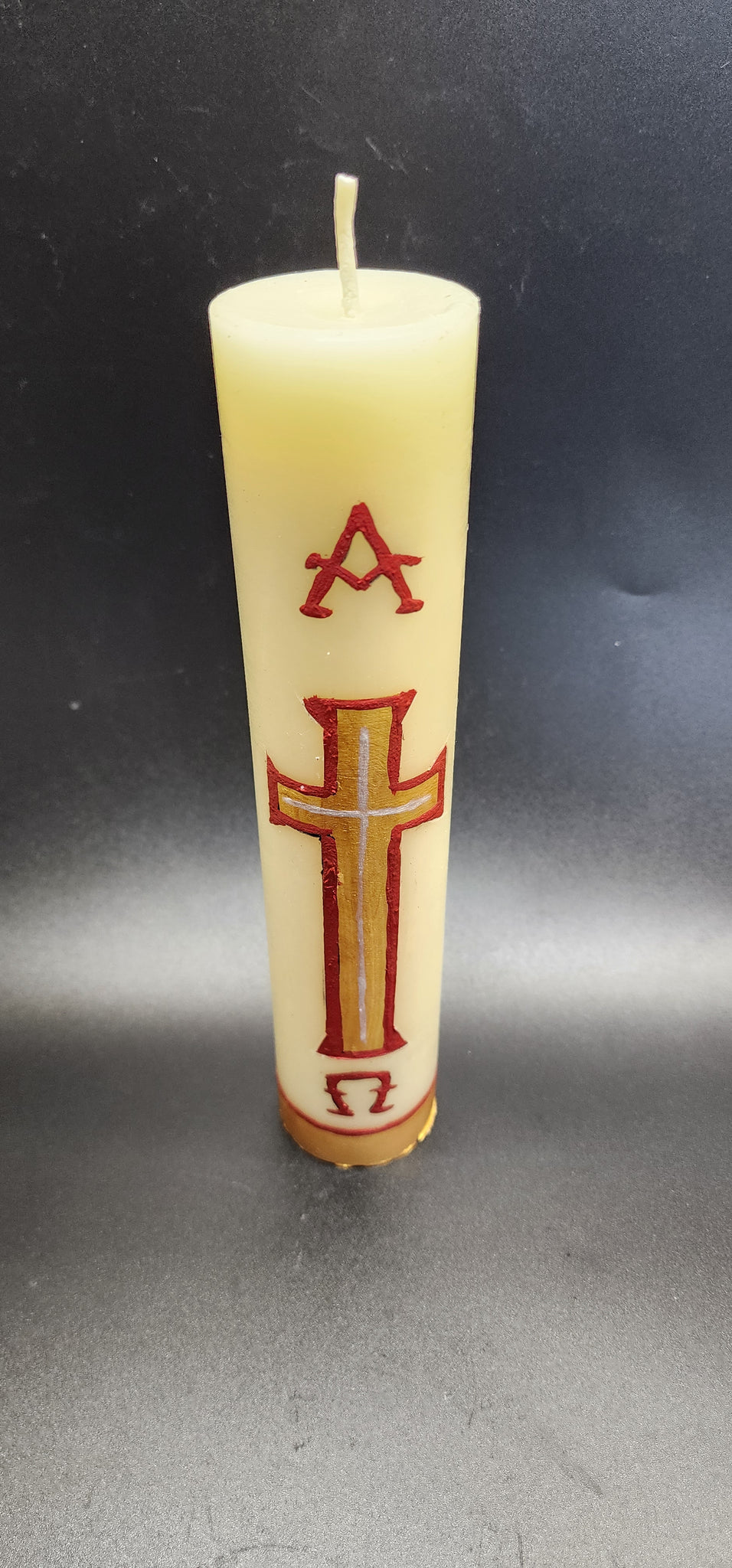 HANDCRAFTED DESIGN: Each candle is hand-painted with religious imagery featuring Alpha Omega Cross on ivory color candle with gold and red accents.