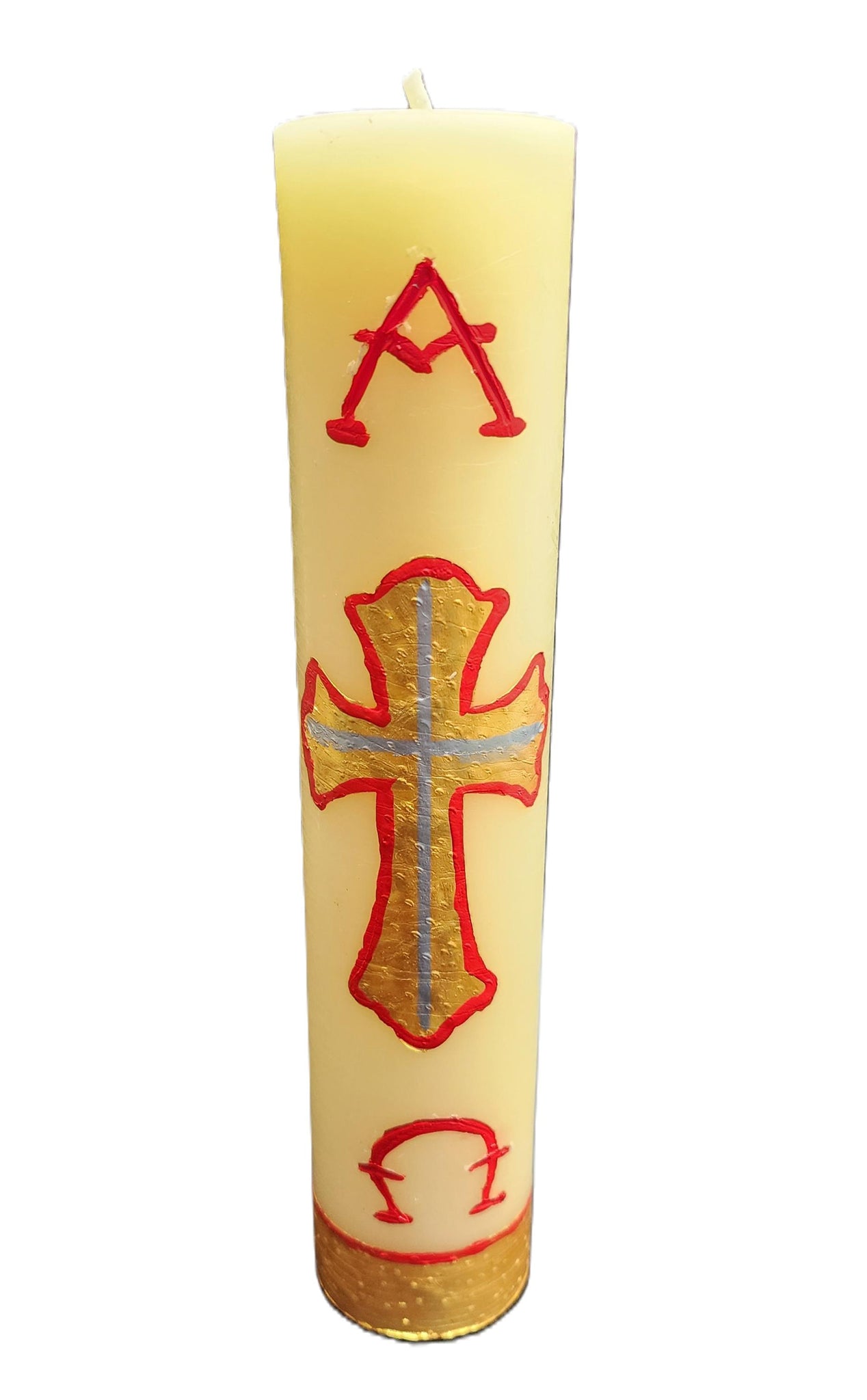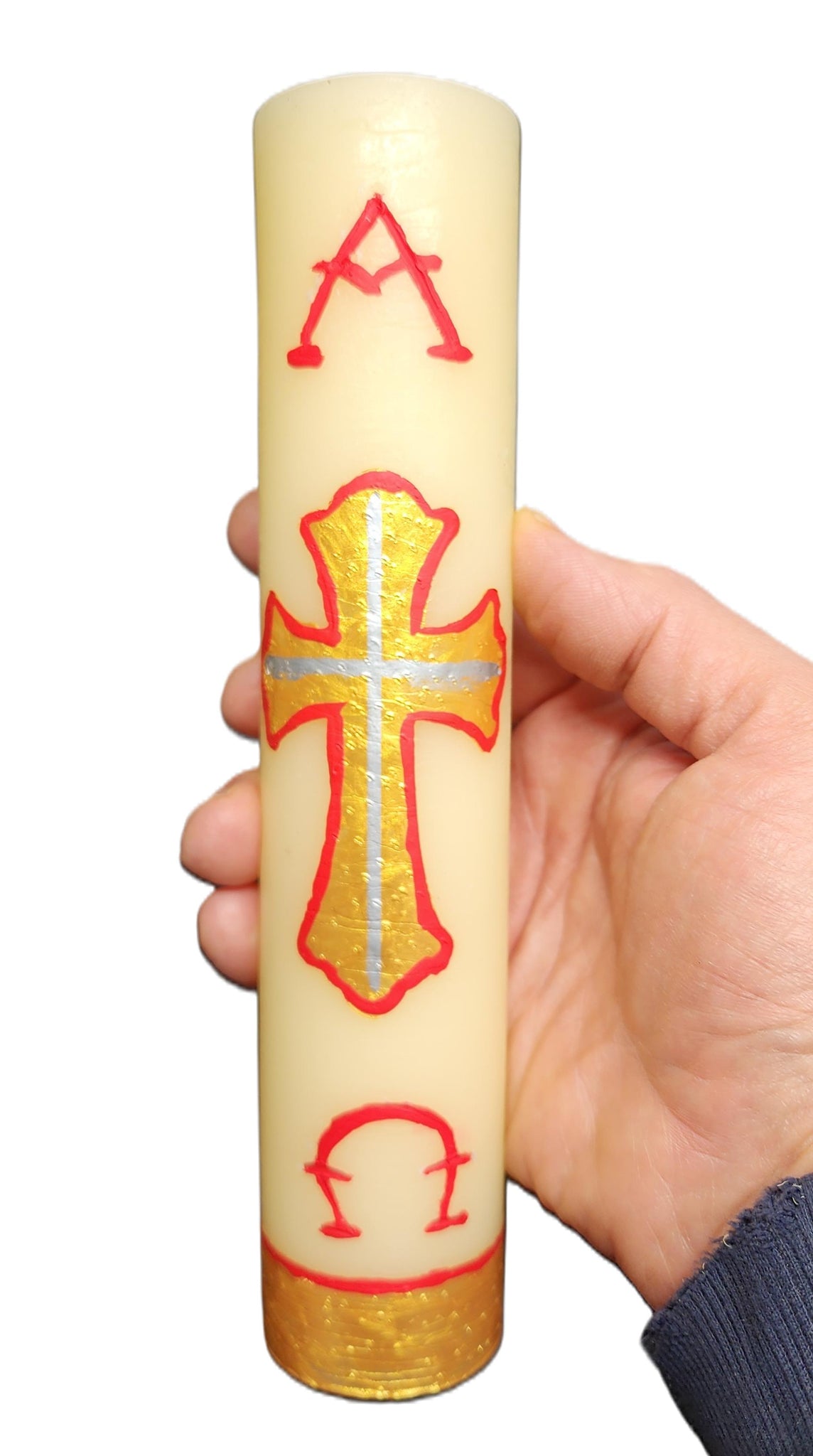 HANDCRAFTED DESIGN: Each candle is hand-painted with religious imagery featuring Alpha Omega Cross on ivory color candle with gold and red accents.